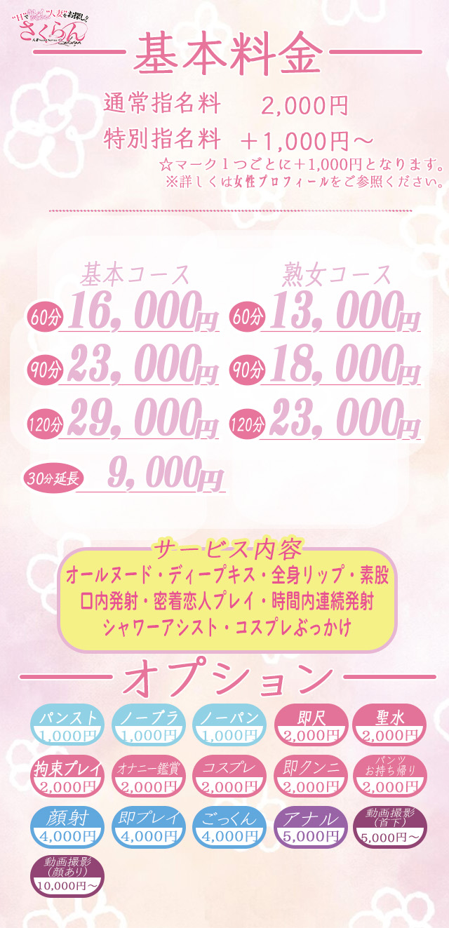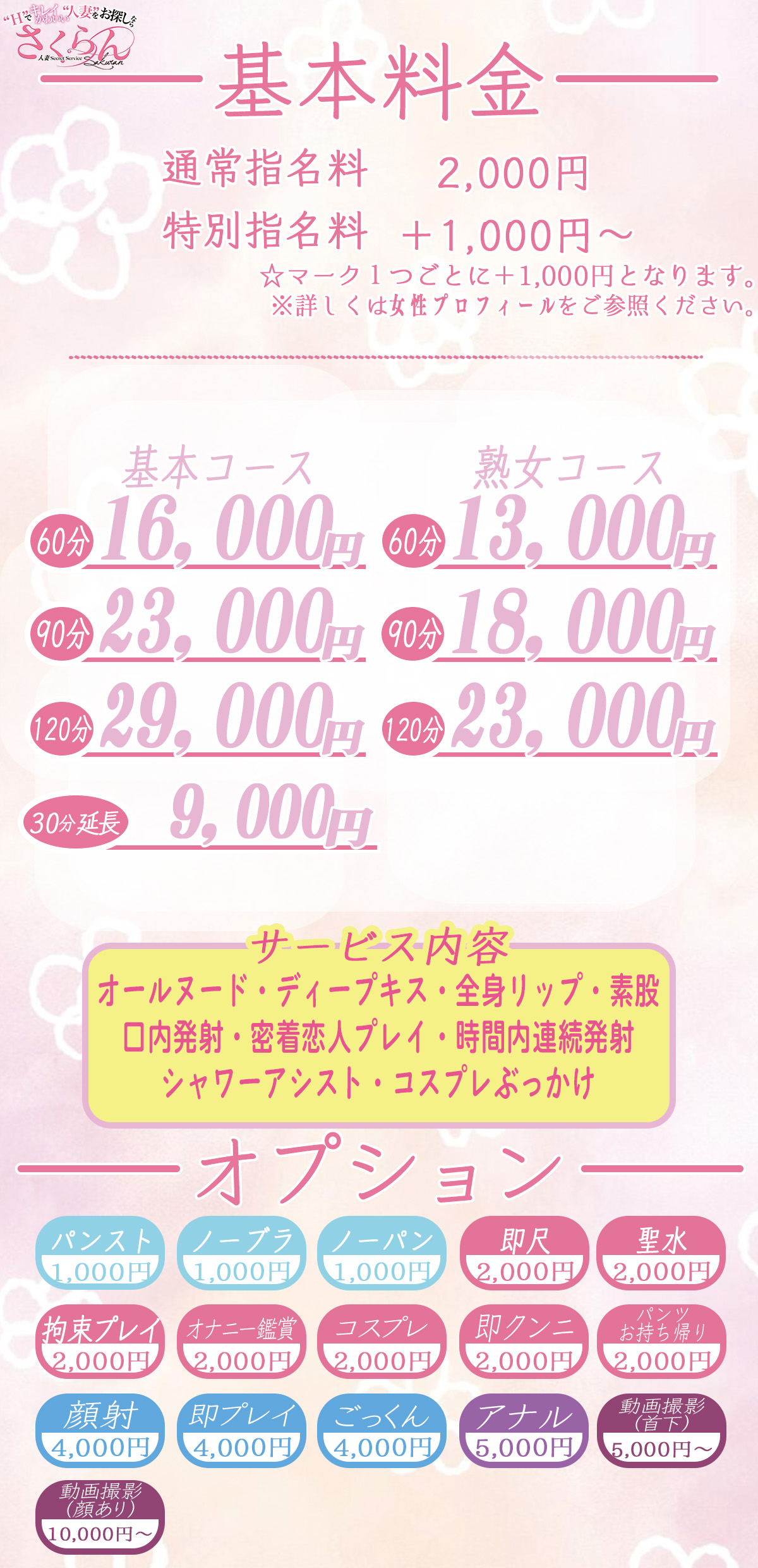 また、女の子によっては追加不可能なオプションもございます。事前にホームページをよくご覧になり、お問い合わせ下さい。